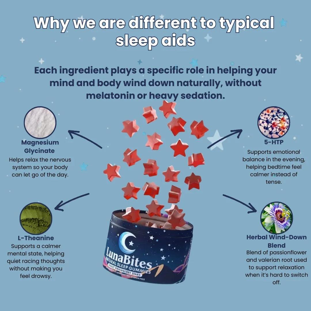 LunaBites isn’t a knock-out pill or a one-night fix. It’s built to restore a proper wind-down, so sleep works the way it’s supposed to — night after night.